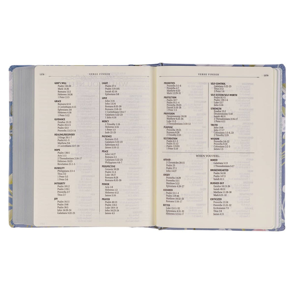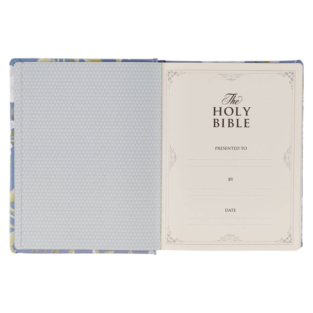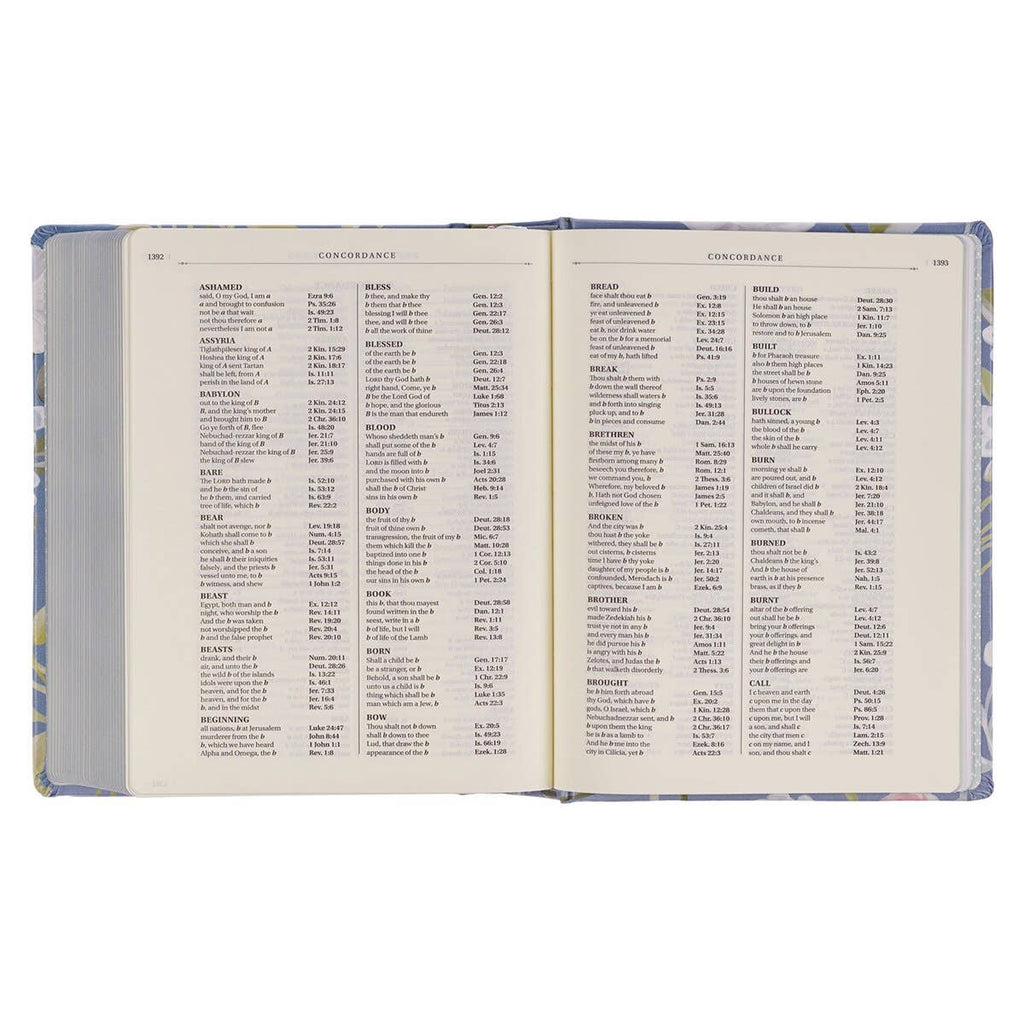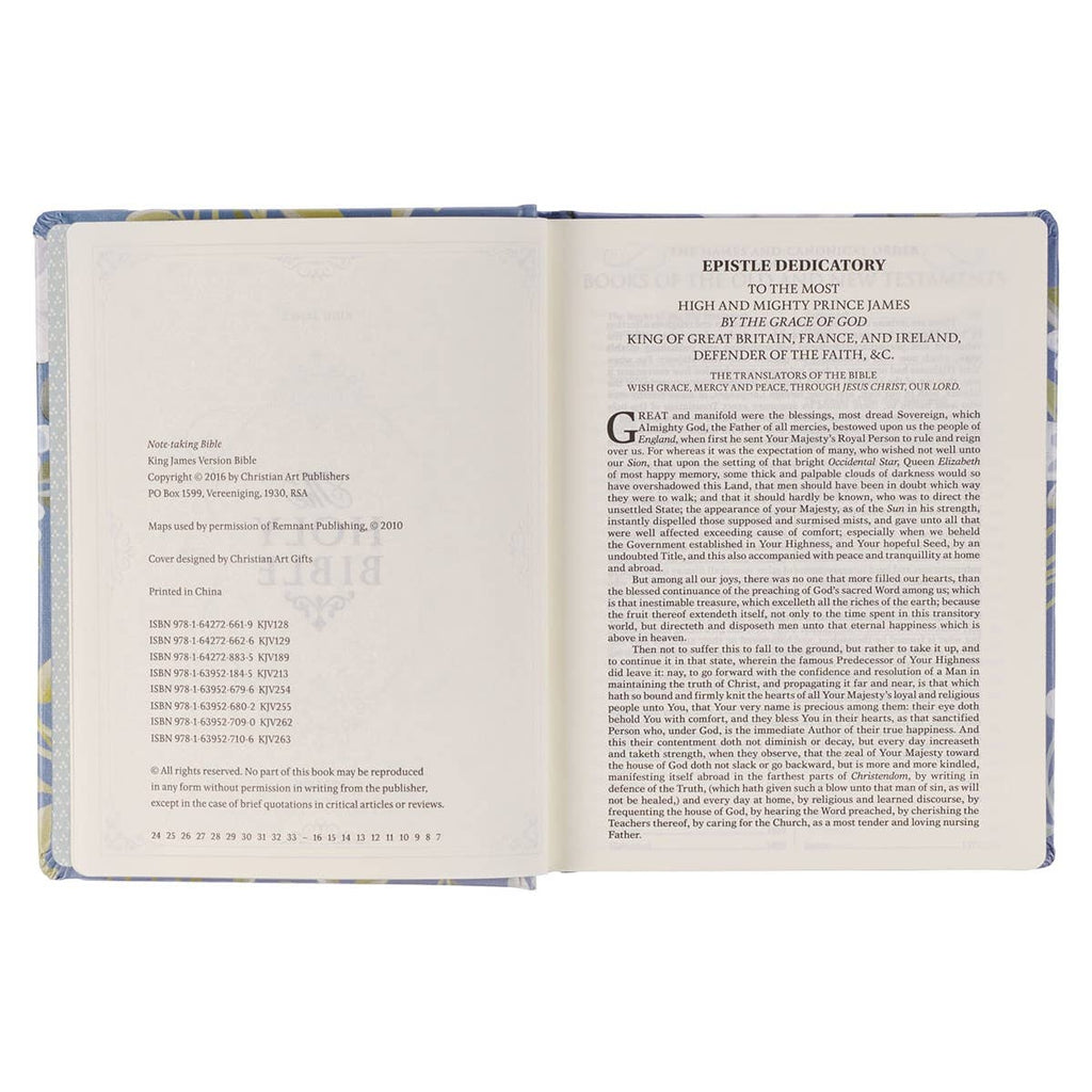 The Blue Floral Hardcover Flora Collection Faux Leather King James Version Note-taking Bible provides space to jot down key points and reflections from sermons or Bible studies to revisit and reflect on layer. Although it has lined space for these annotations, the beautiful, colorful cover design invites you to add color and images to the text or your notes to highlight or accent important ideas you wish to remember.