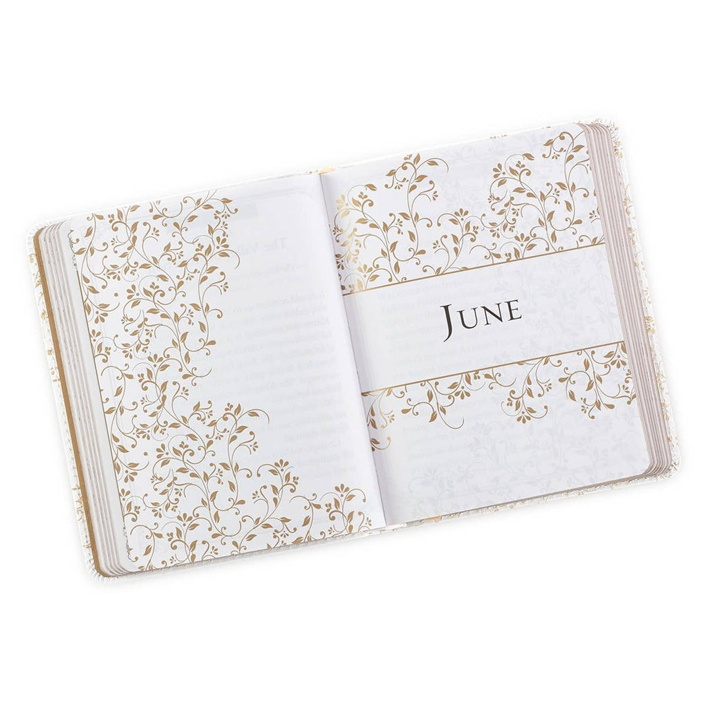 White faux leather cover with gold foiled creeping vine design, Gold foiled title, Flexcover, 366 daily devotions, 400 pages, Gilt-edged pages, Gold-foiled interior design elements, Attached ribbon marker, Presentation page, Size: 5.6" x 4.5" x 0.8" (142 x 114 x 20mm)